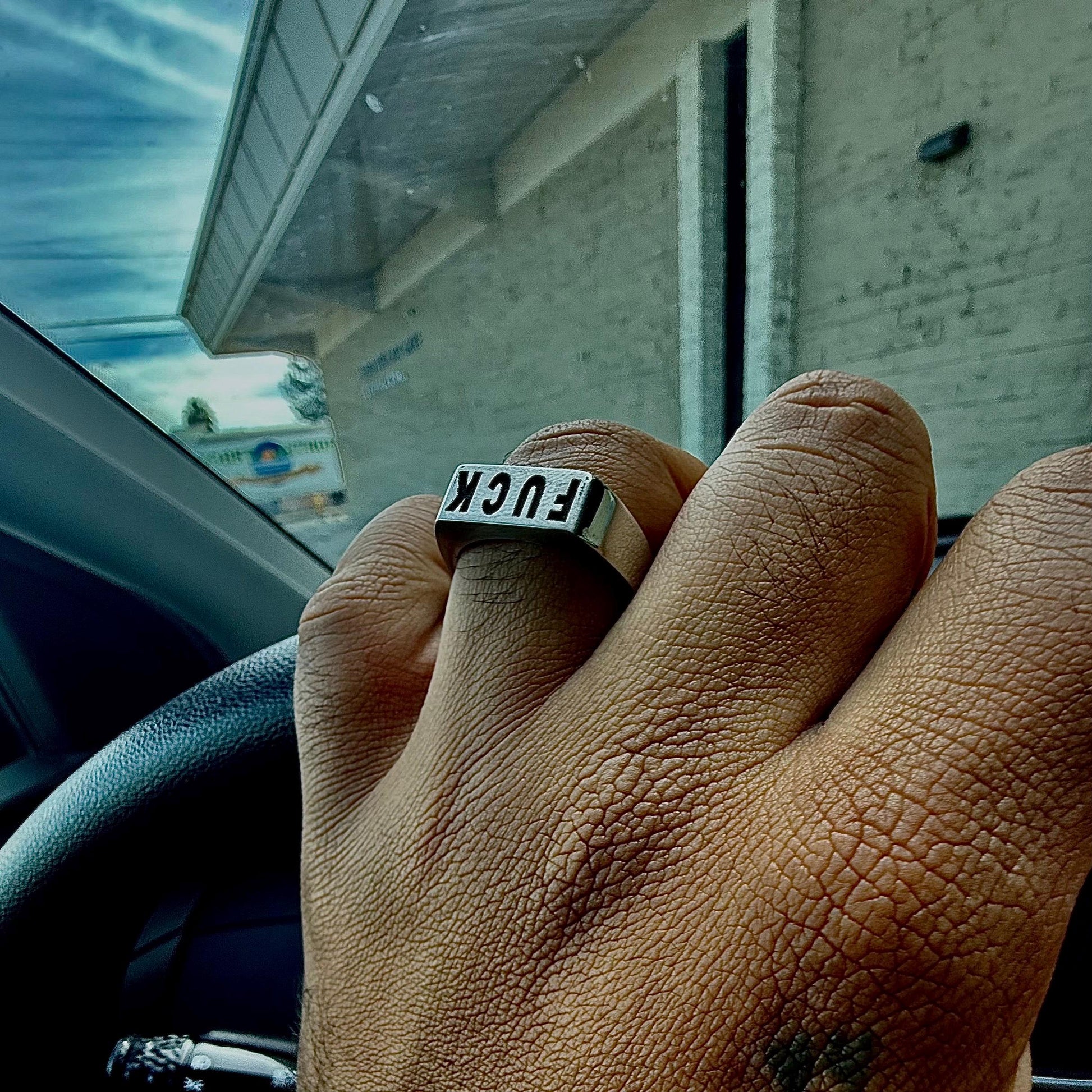 A deeply embossed signet ring, with the word FUCK in thick letters.